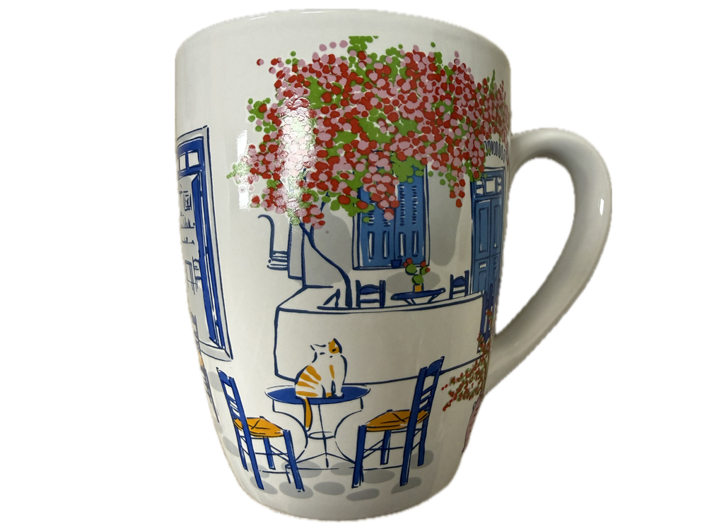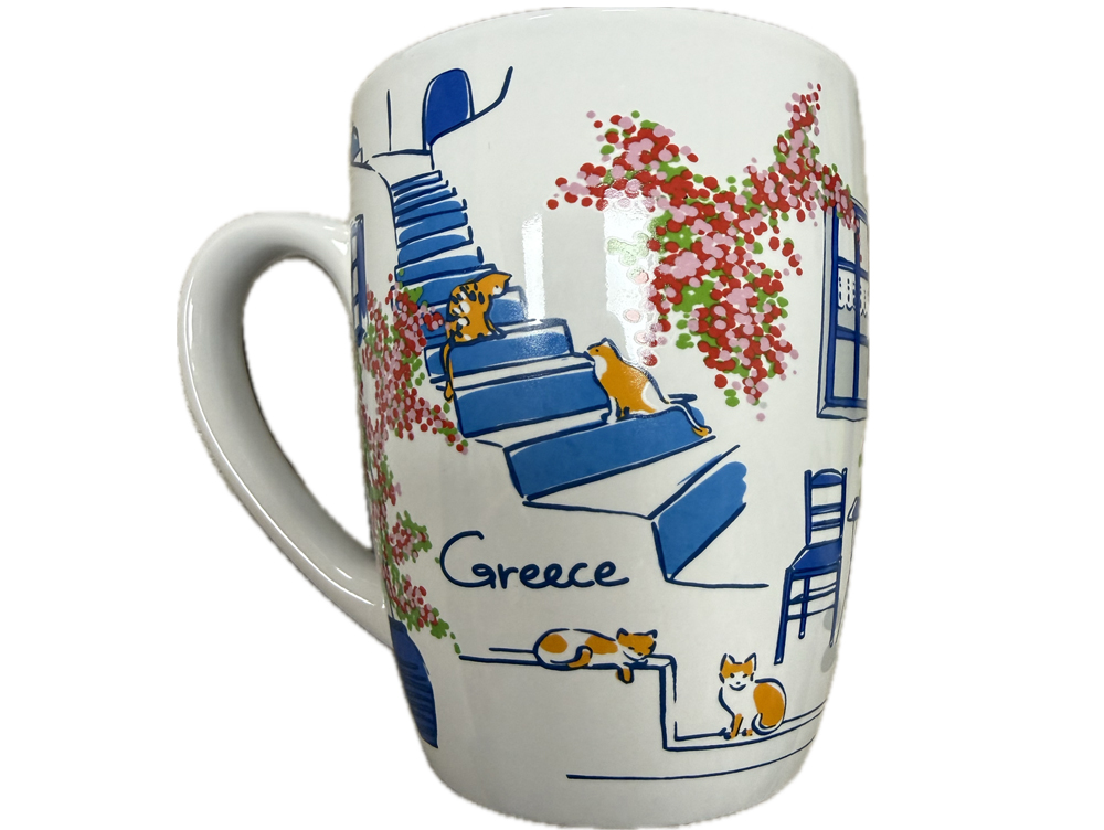 Leuke Griekse mok bougainville en katjes. Ideaal voor je koffie, thee, melk etc. Formaat: 10 x 8.3 cm. (300 ml)