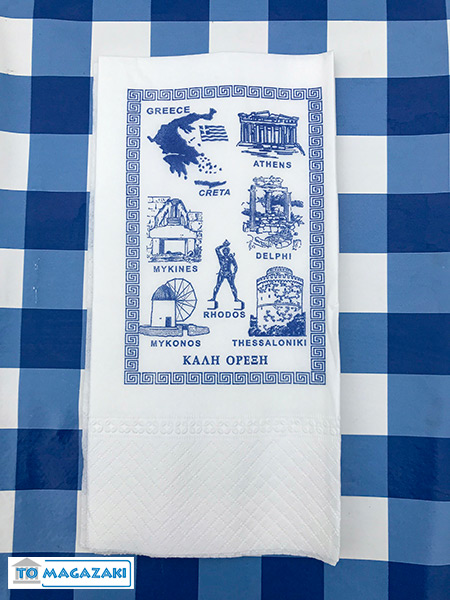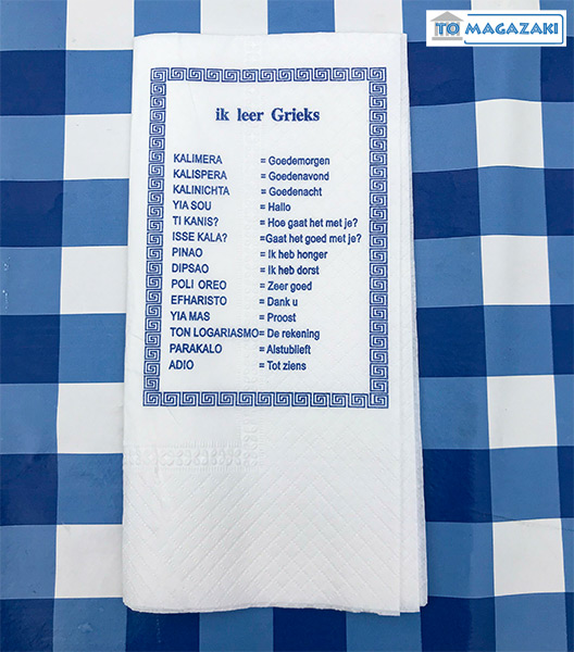 Griekse servetten. Ga je Grieks koken voor vrienden of familie? Dek je tafel dan in Griekse stijl en dan mag een Grieks servetje natuurlijk niet ontbreken! Onder het genot van de Griekse maaltijd leer je ook nog een woordje Grieks!
