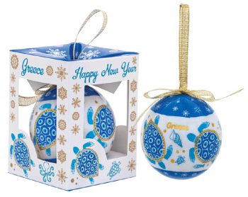 Kerstbal met de Caretta Caretta schildpad. Een leuk cadeautje voor de echte Griekenland liefhebber. Doorsnede 8 cm. De maat is die van een ‘normale’ kerstbal. Kleur blauw boven en onder is lichter dan de afbeelding.
