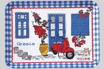 Op het dienblaadje staat een typisch Grieks tafereeltje met blauwe deur, bloemen en fiets. Maat: 17 x 12 cm Materiaal: Melamine